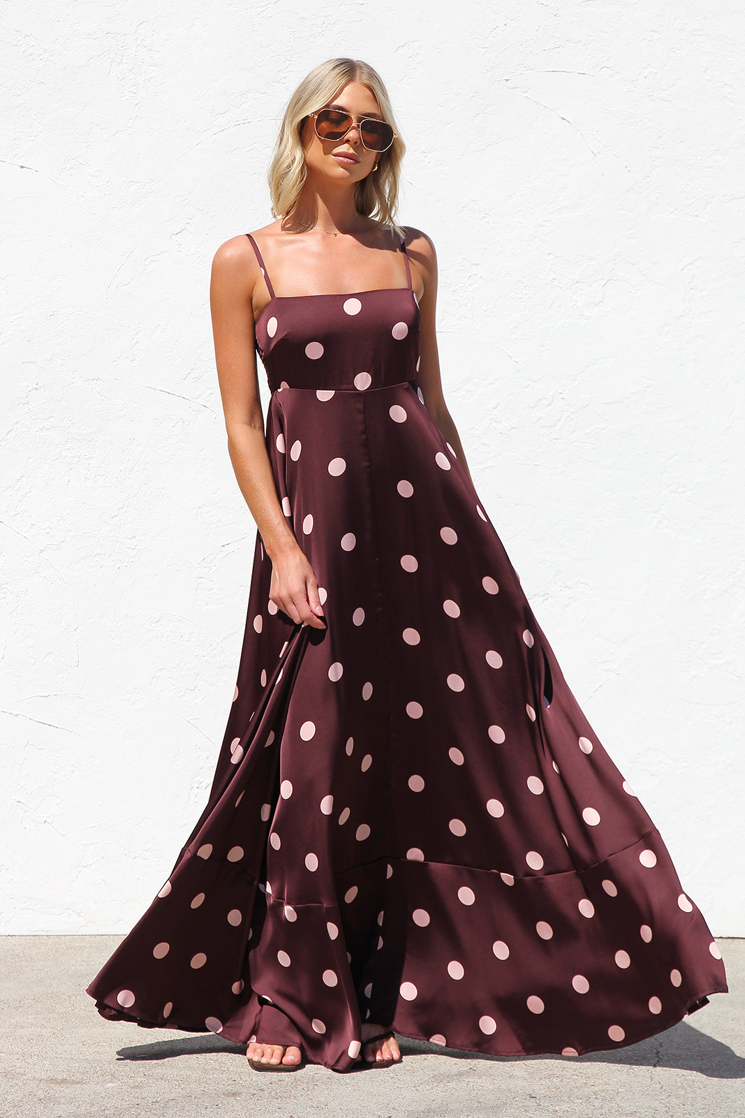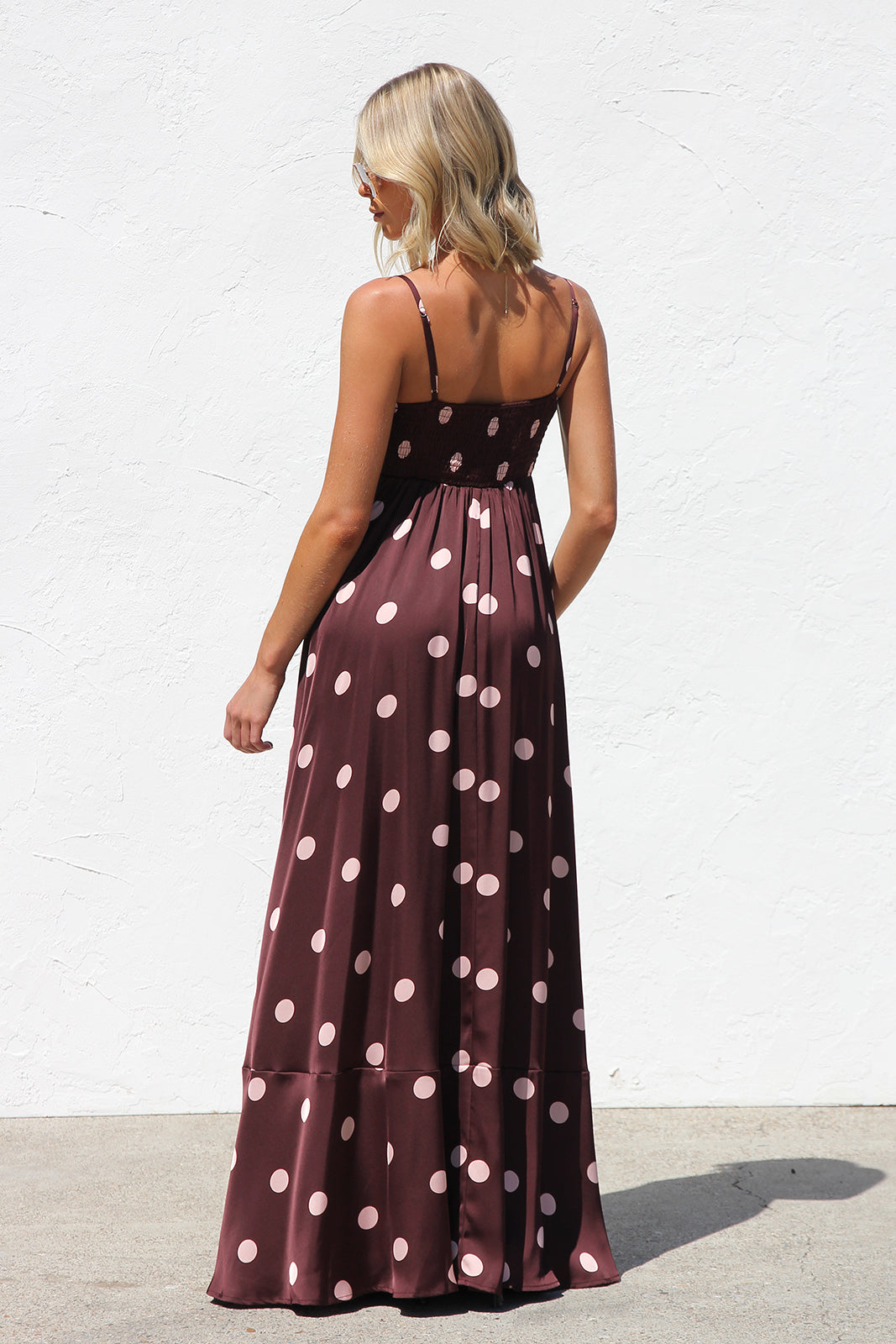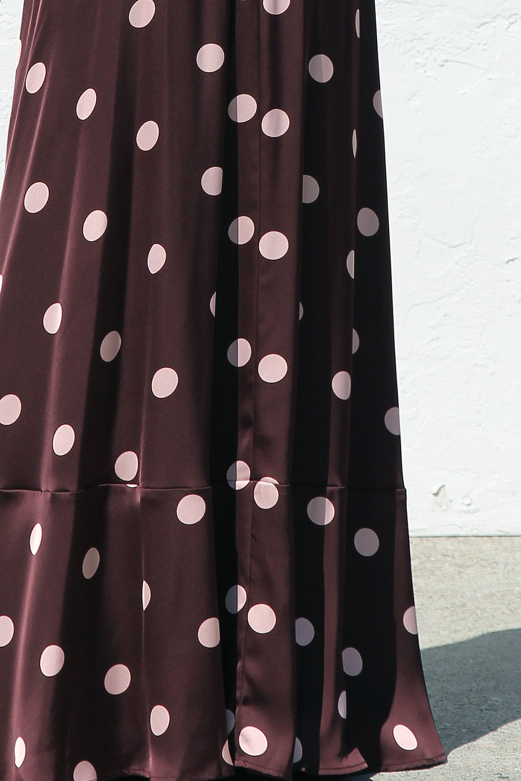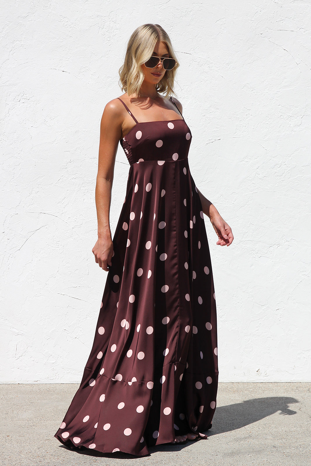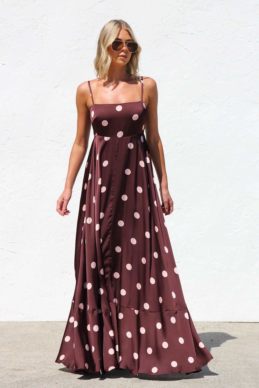 - brown base with pink polka dot print maxi dress