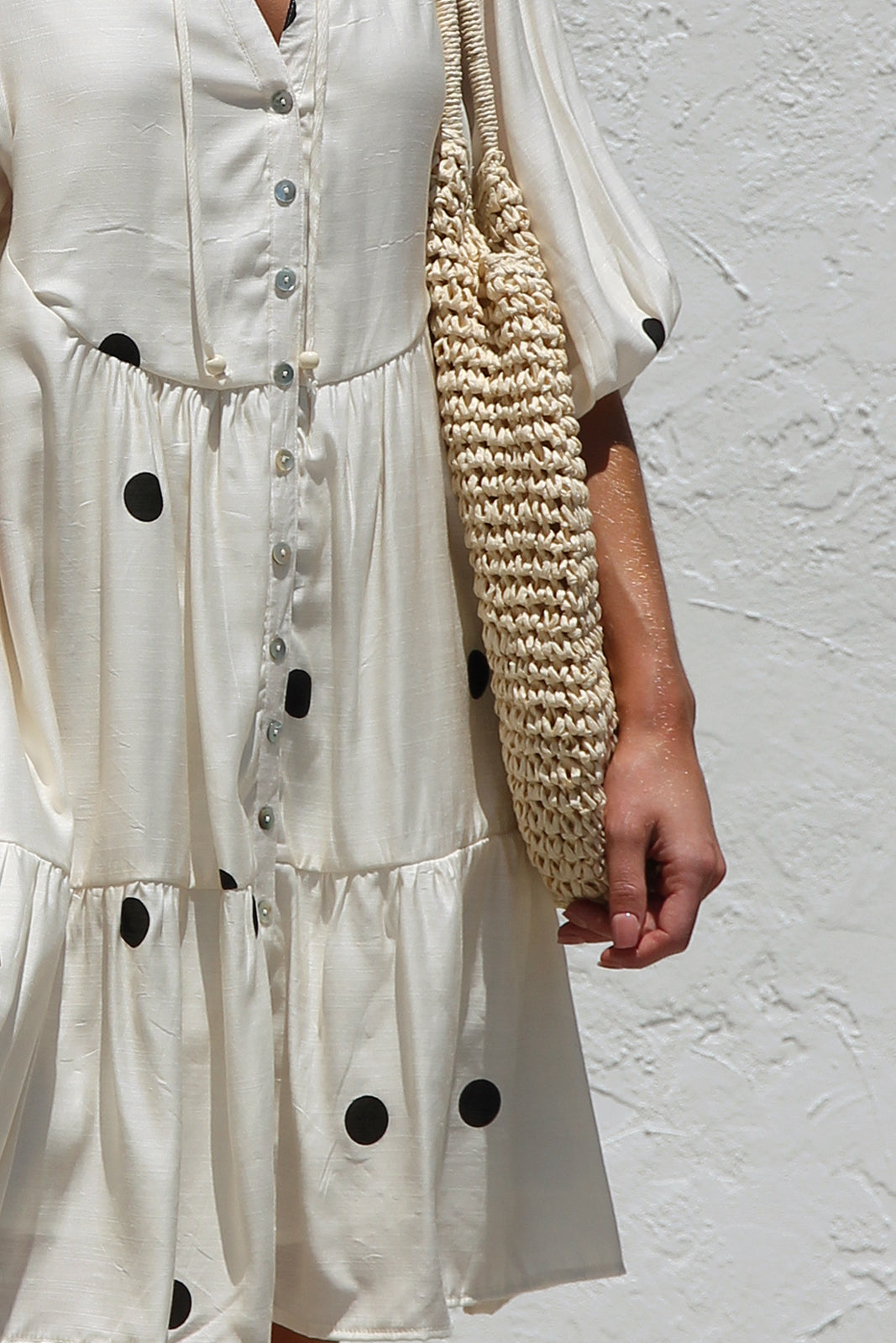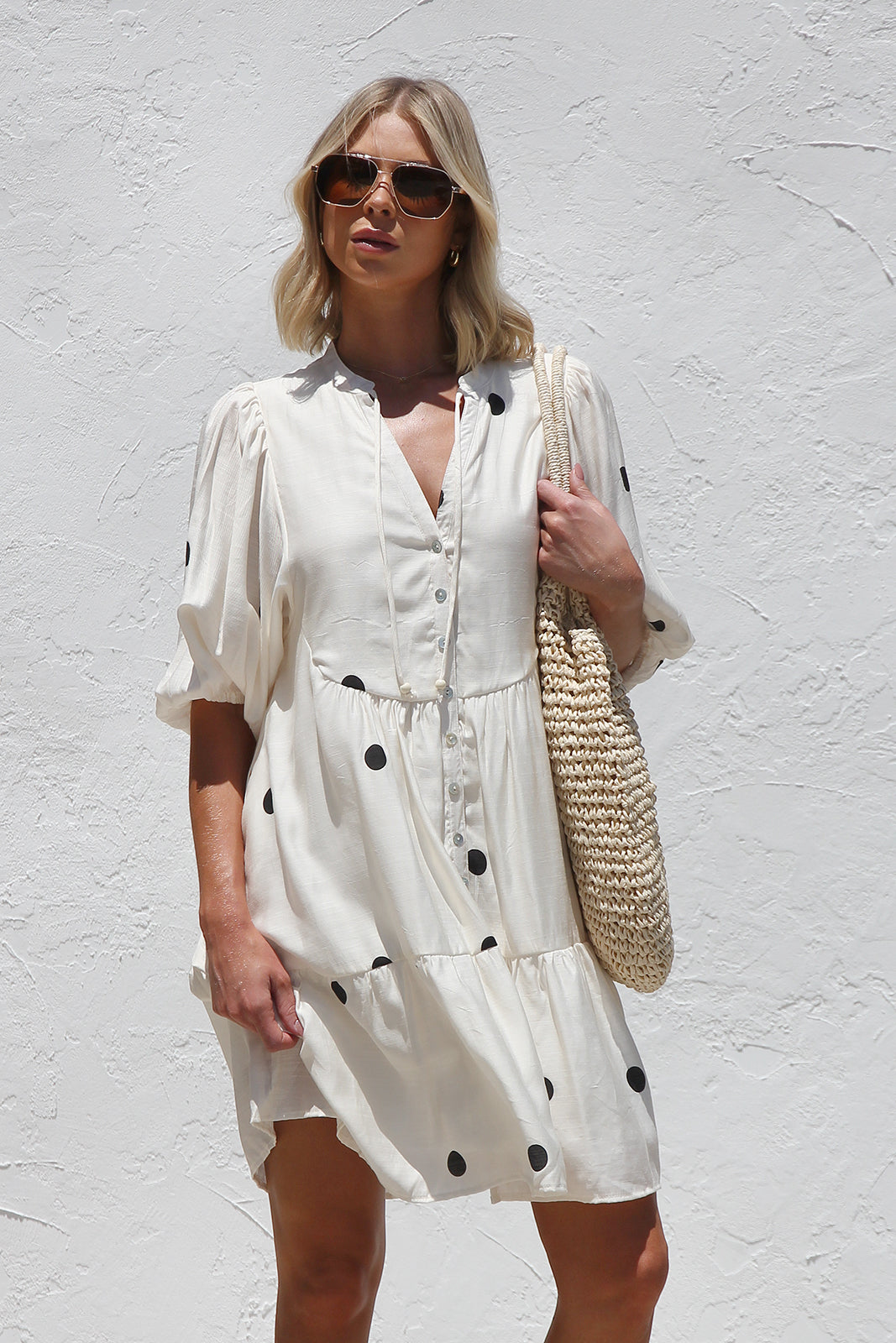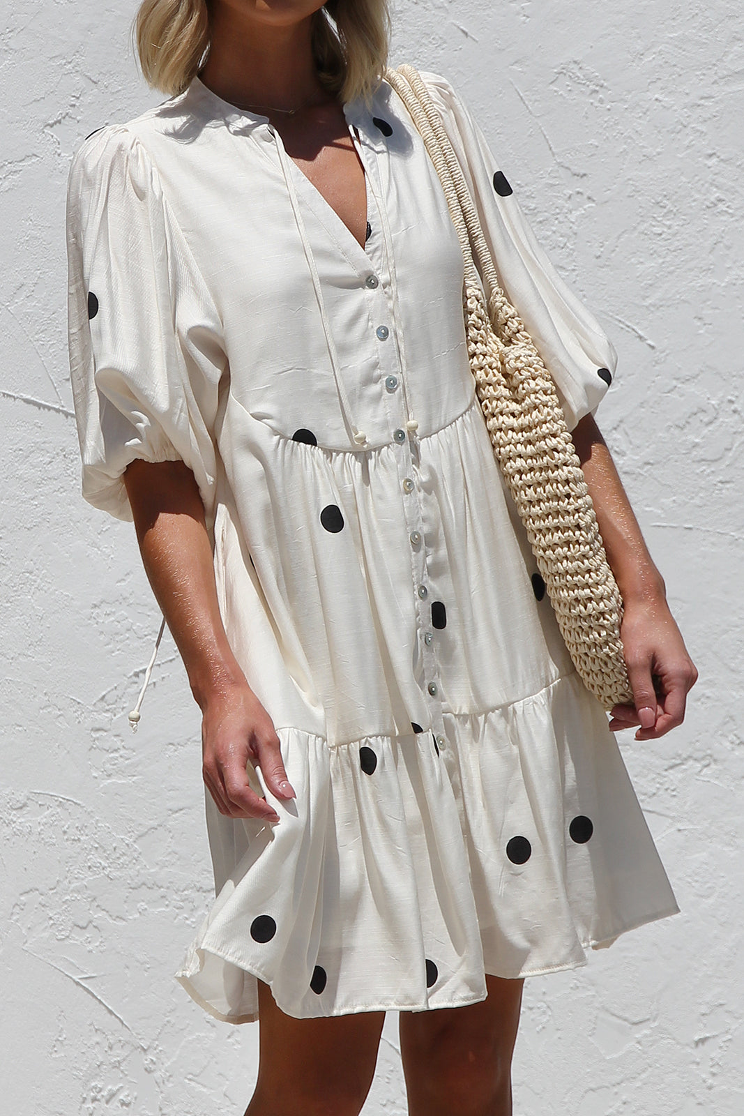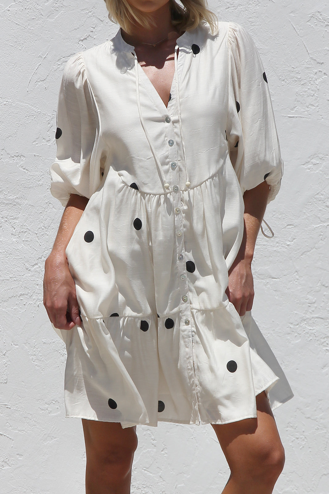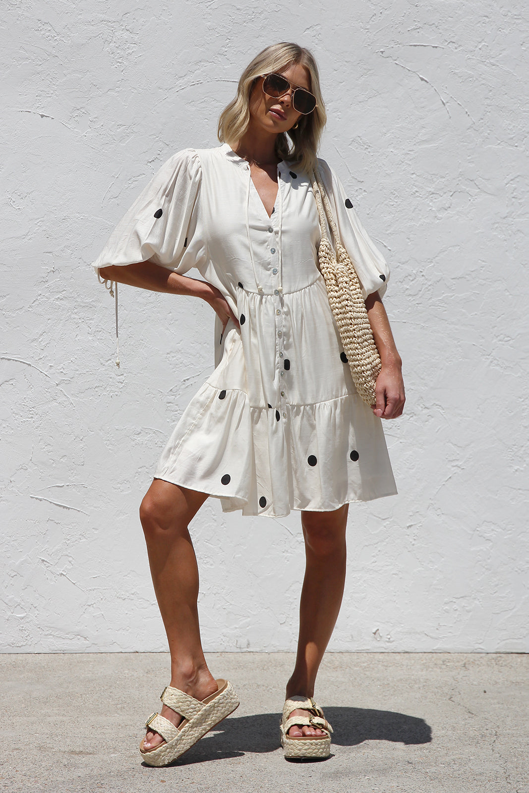 - black polka dot on beige base smock style dress