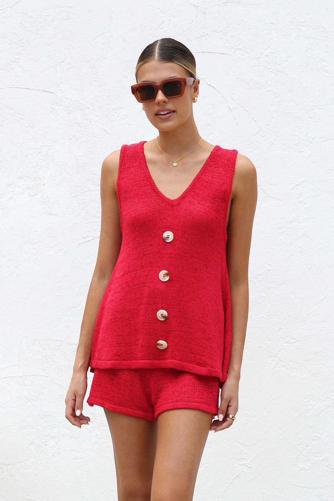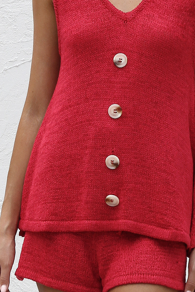 - red crochet knit like top and short set