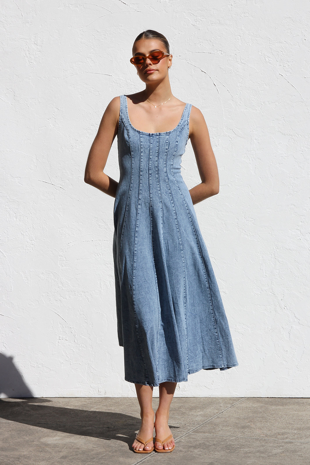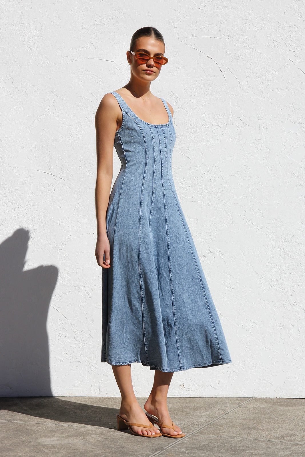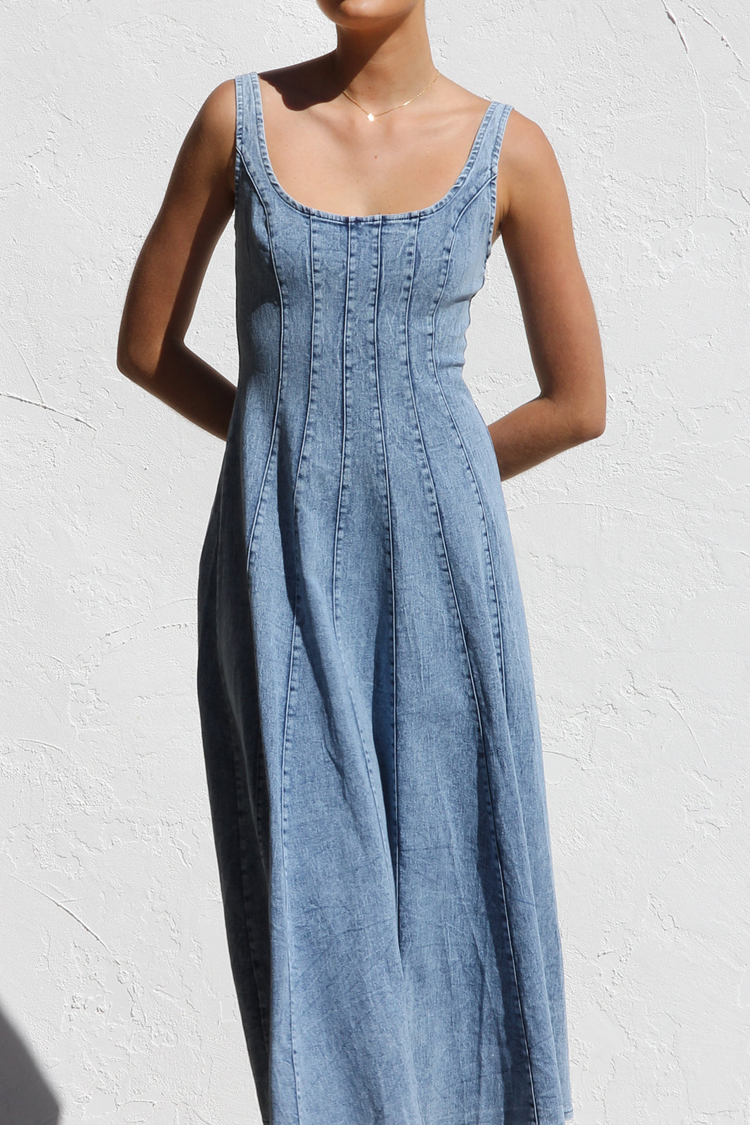 - washed denim midi dress in mid-blue