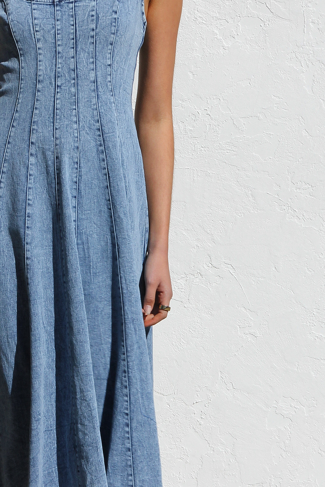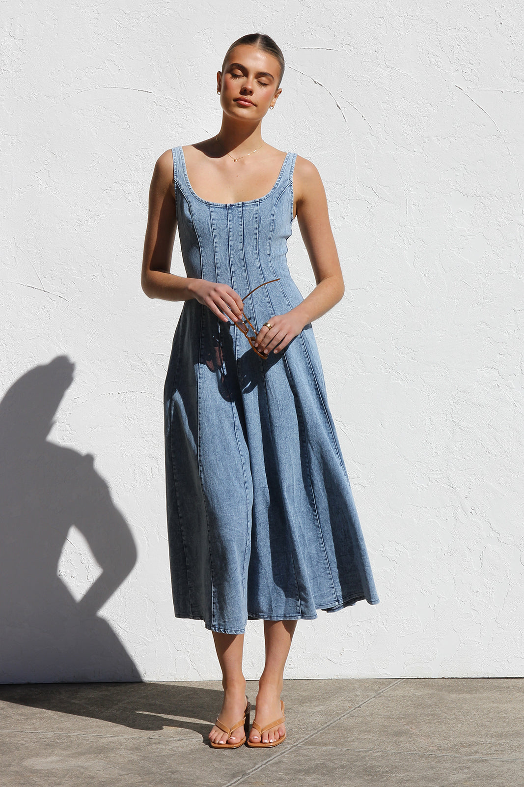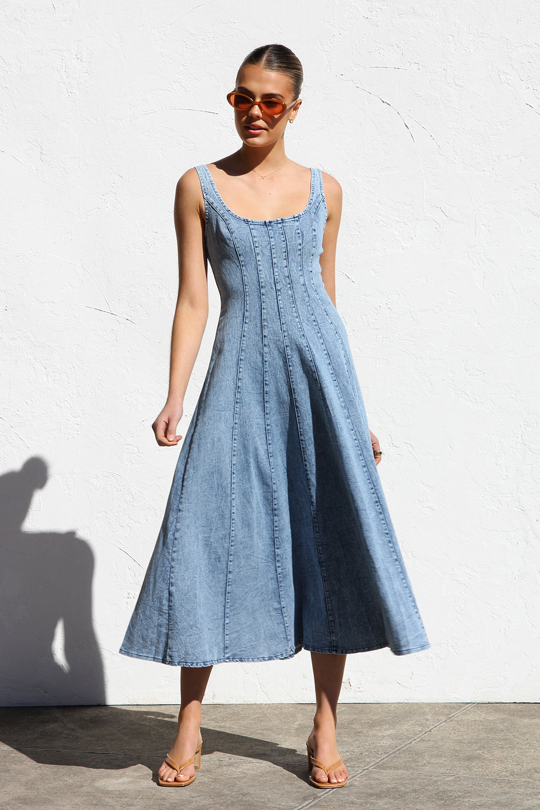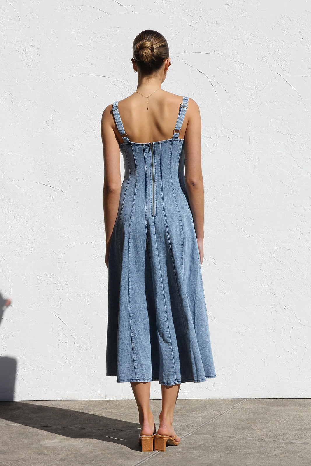 - washed denim midi dress in mid-blue