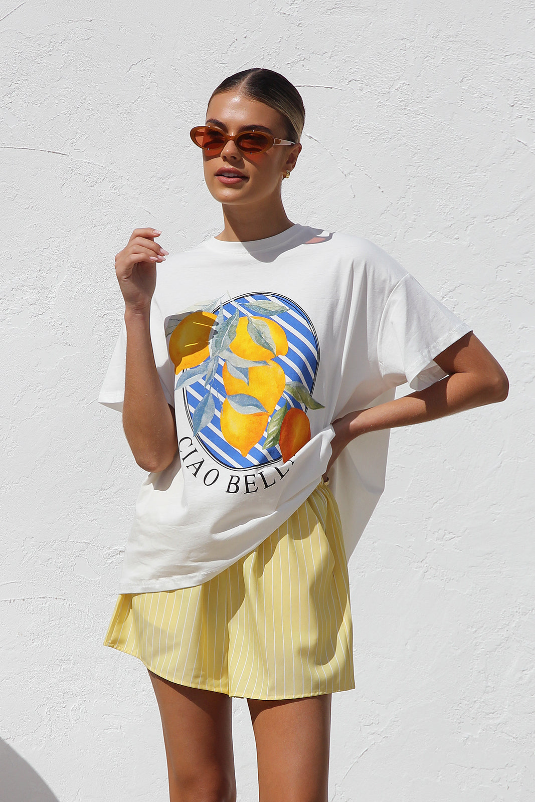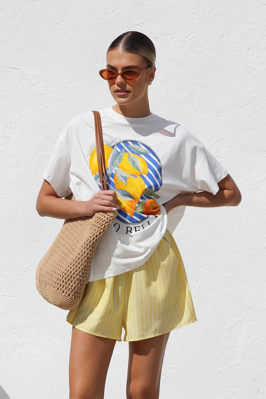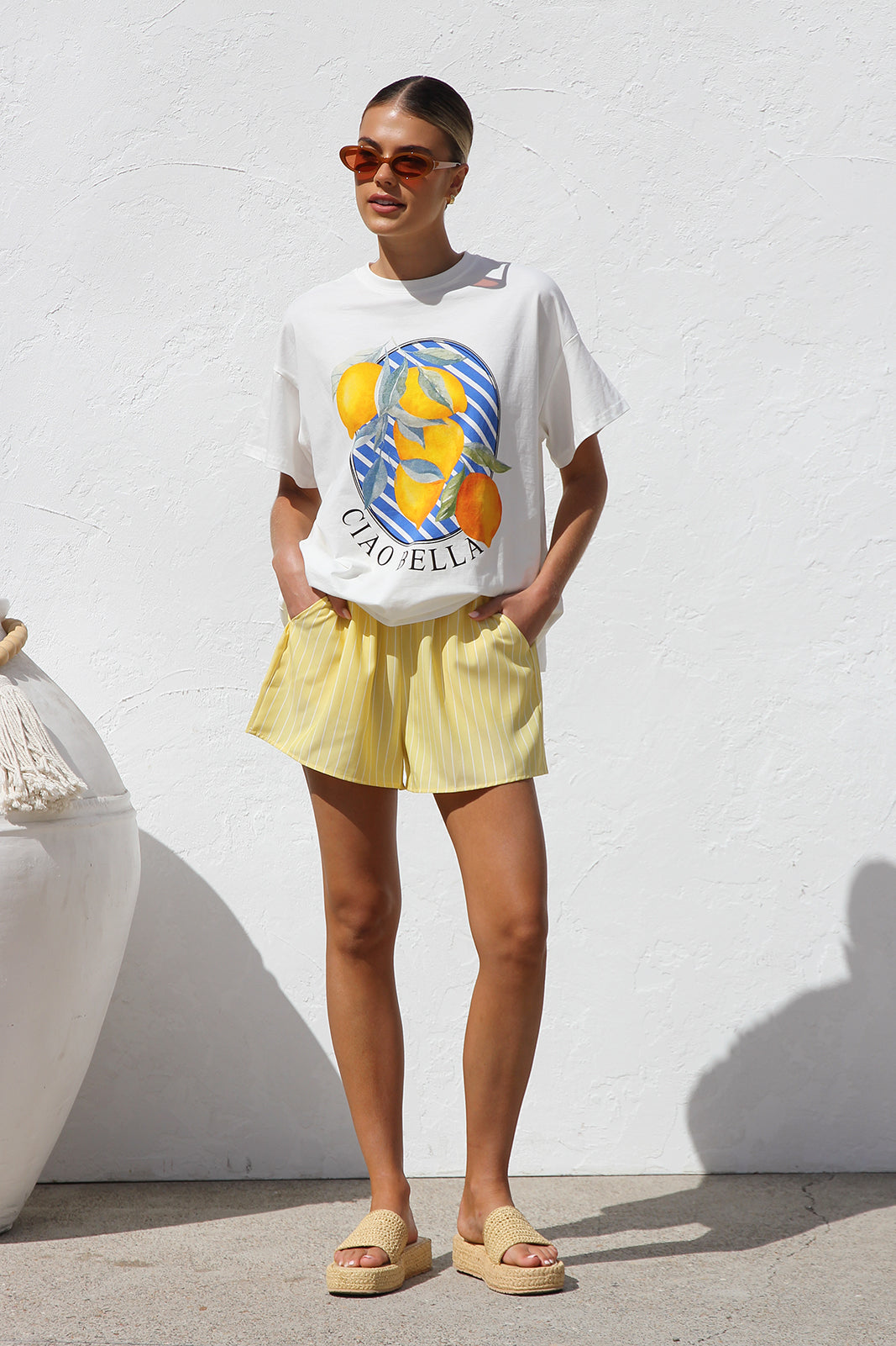 • yellow and white striped elastic waist shorts