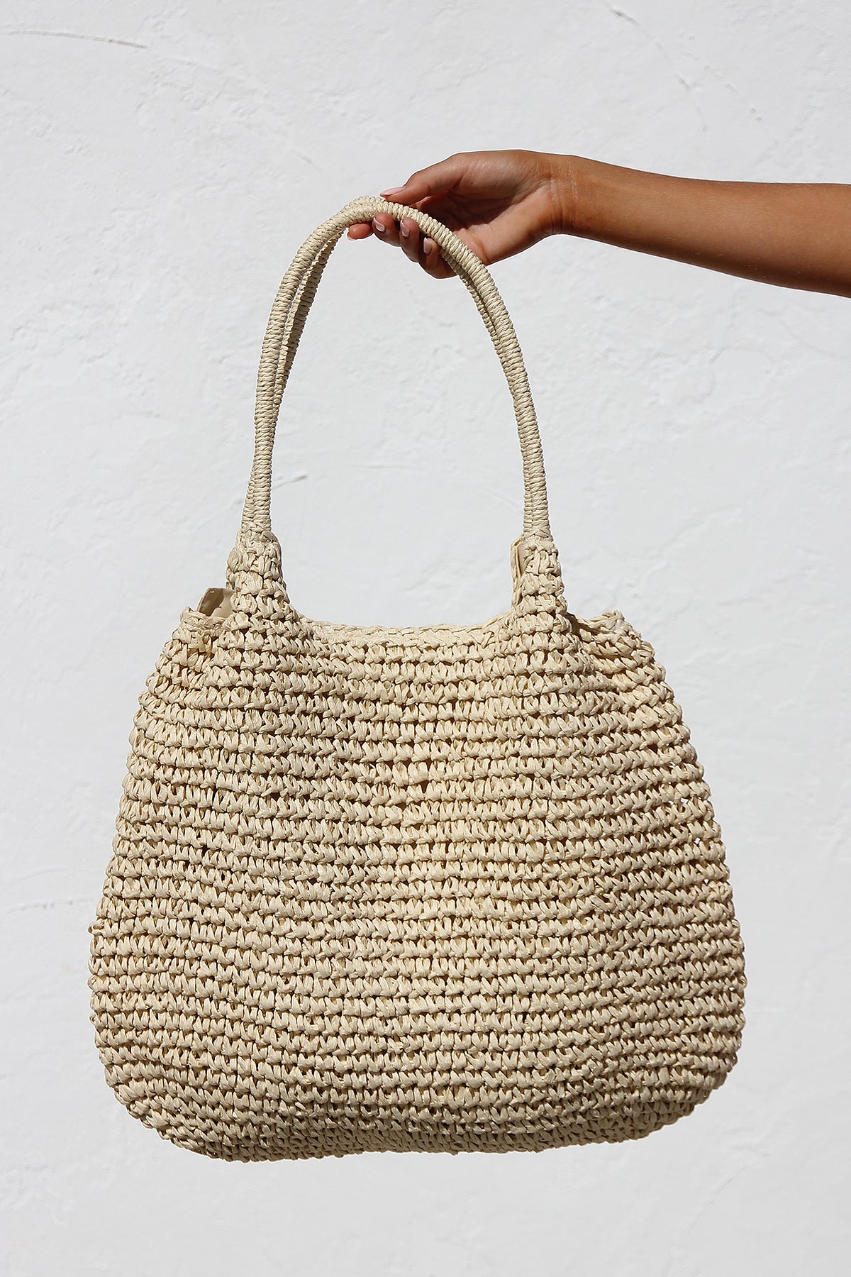 - this medium size tote features a straw crochet exterior