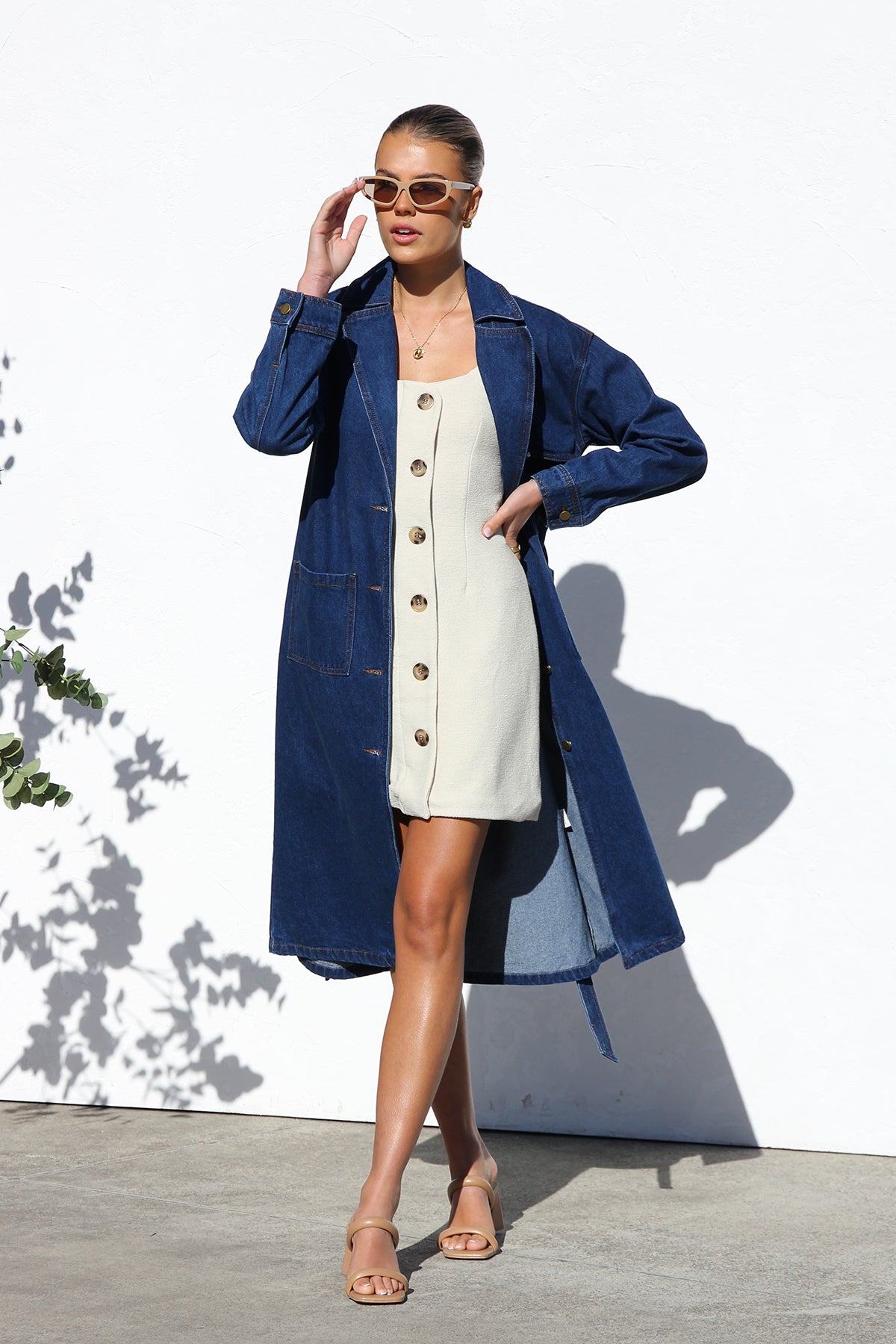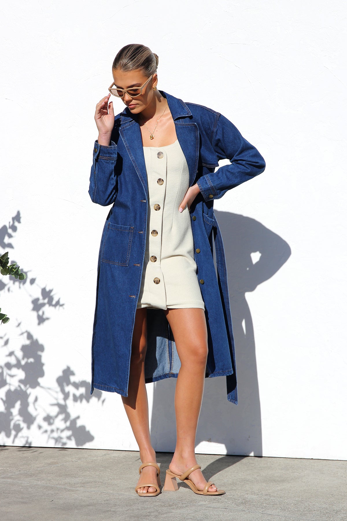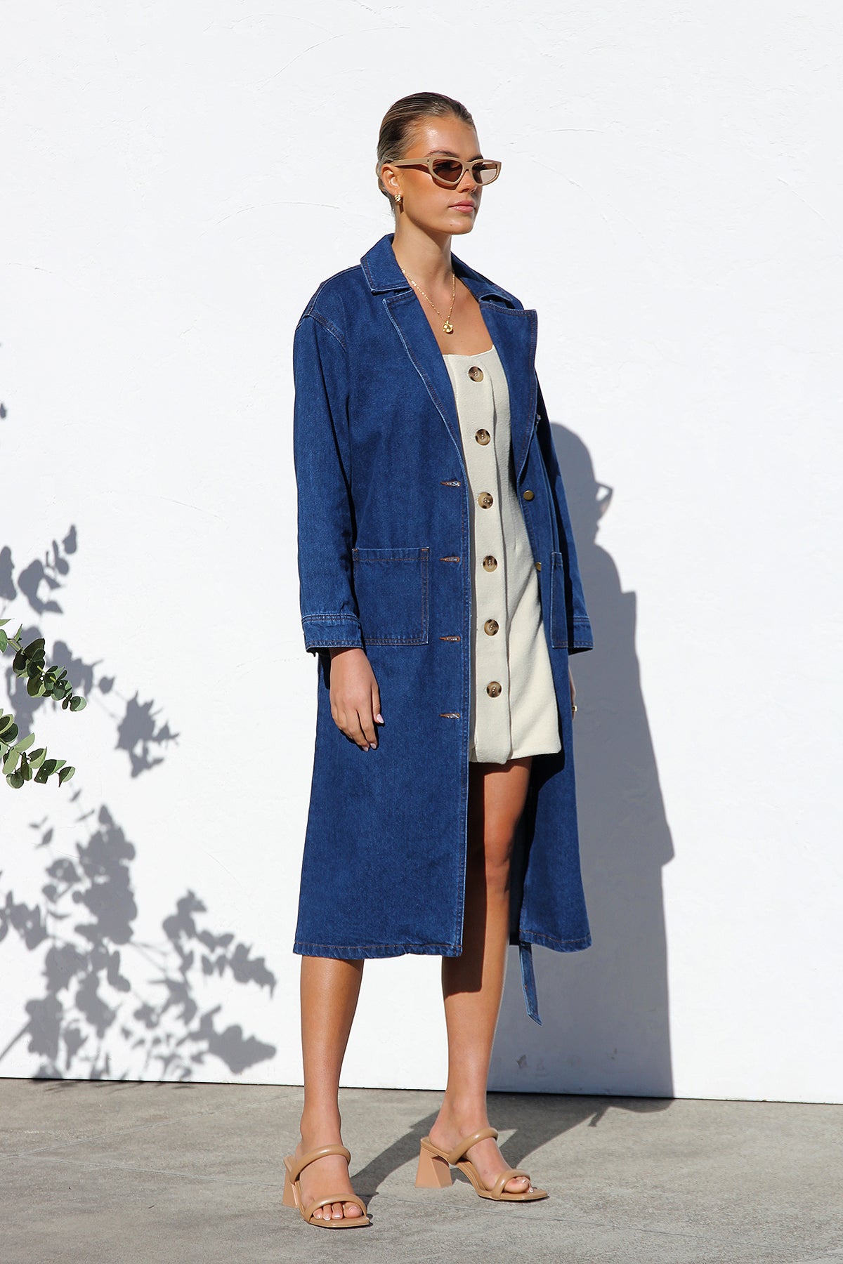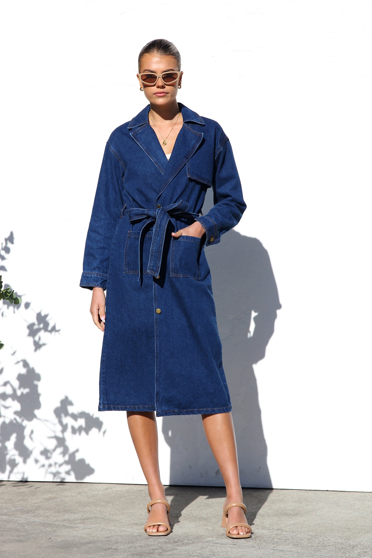 - long-line denim trench coat