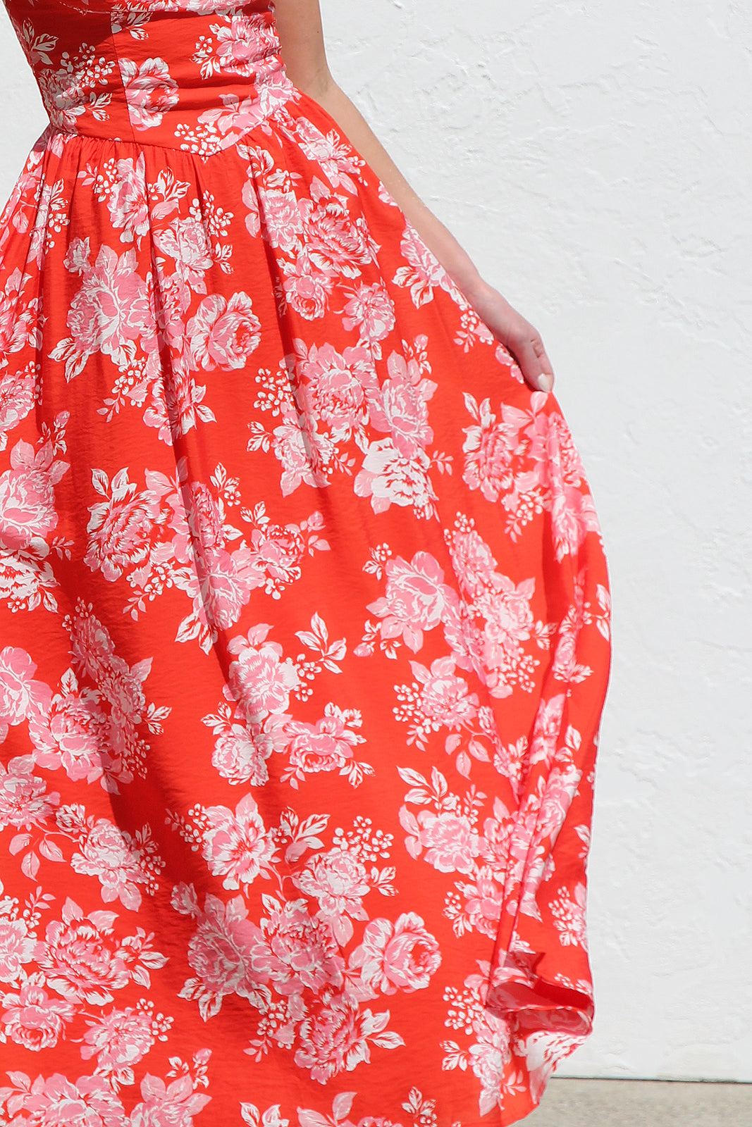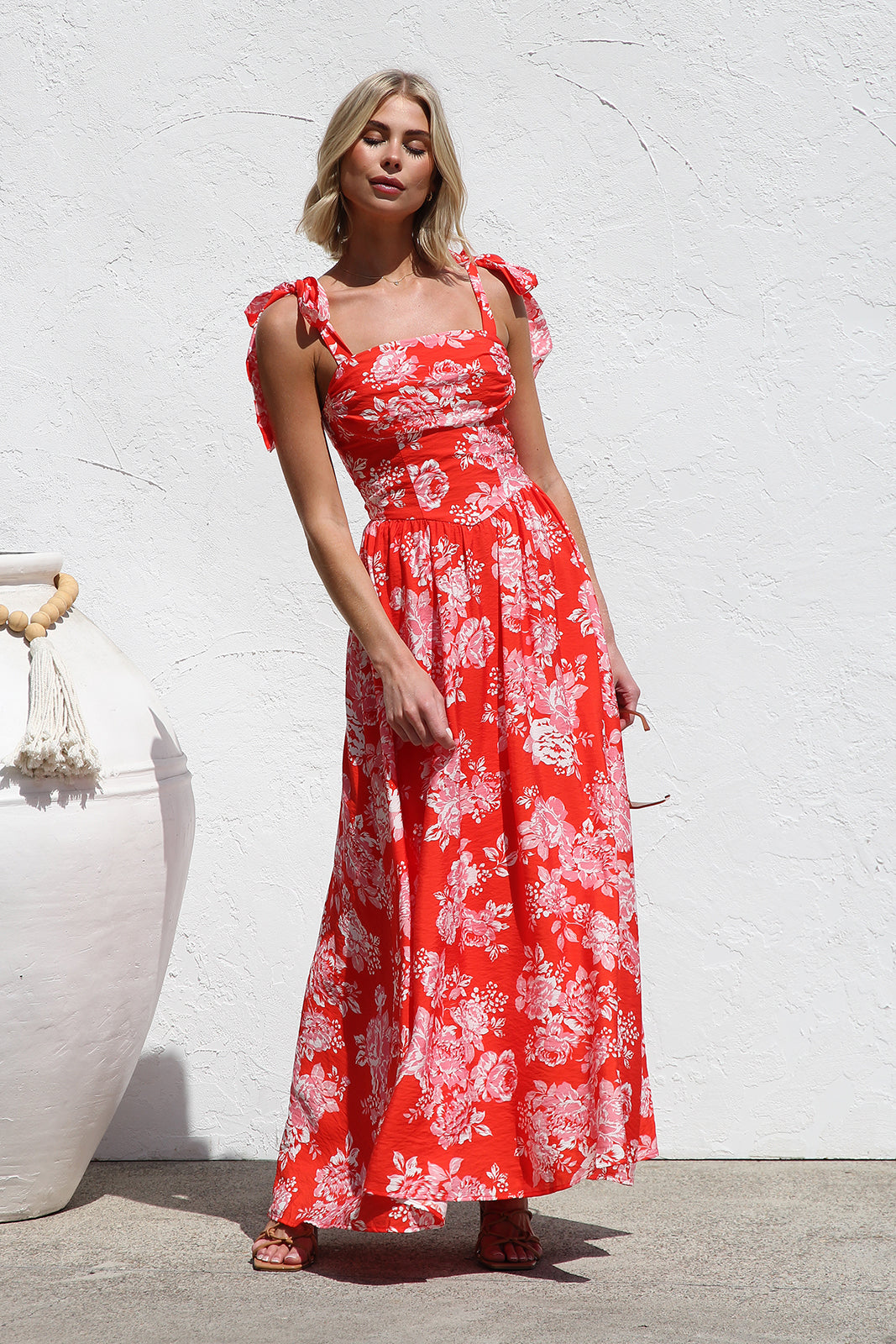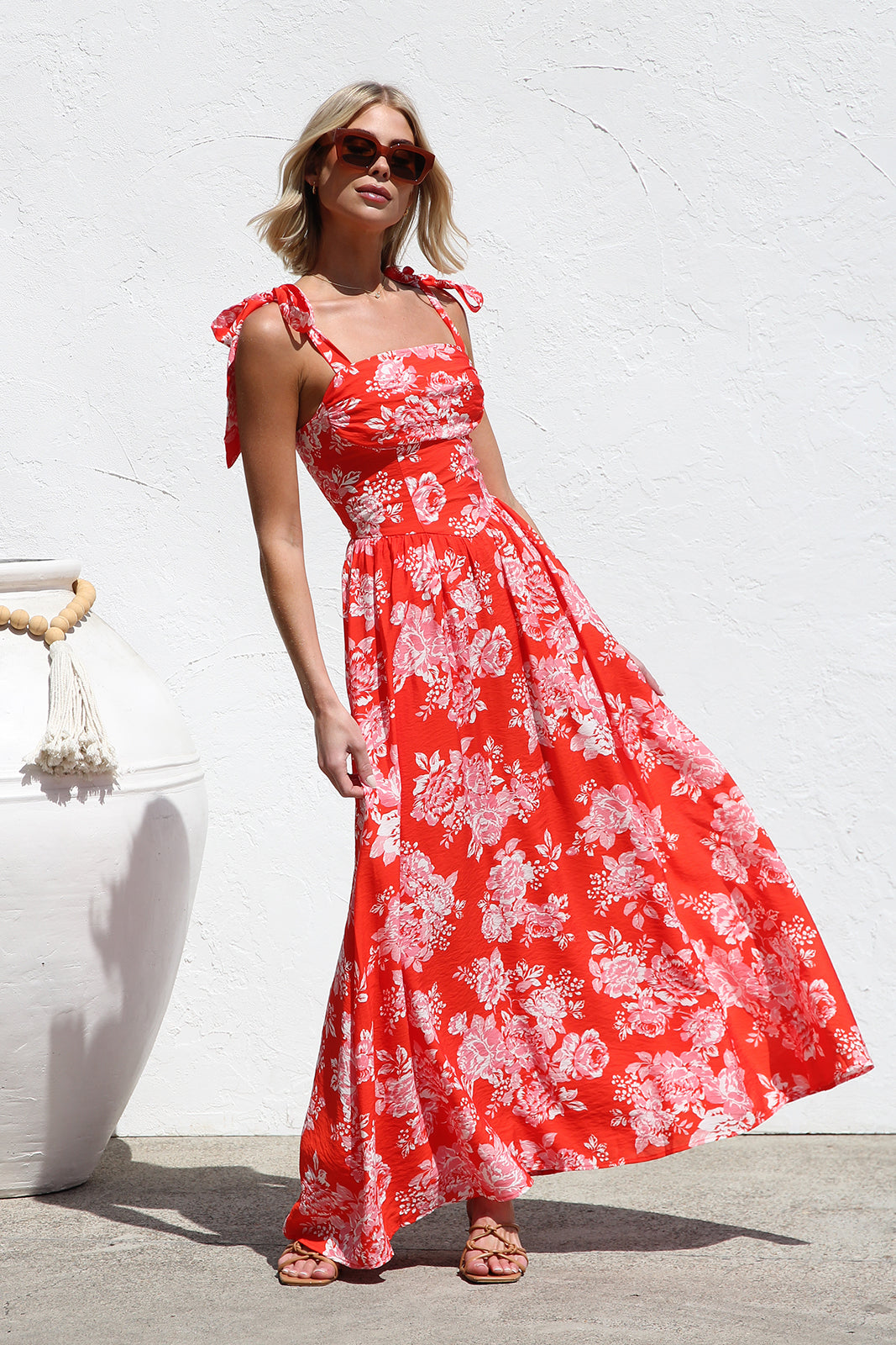 • red/orange base with contrast floral print maxi dress
