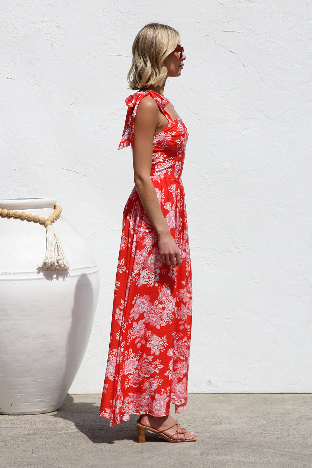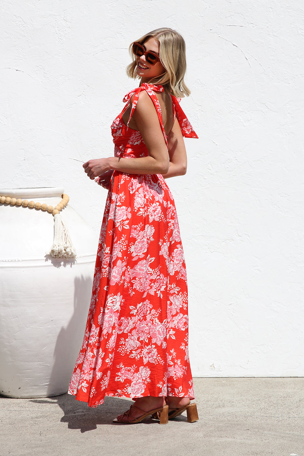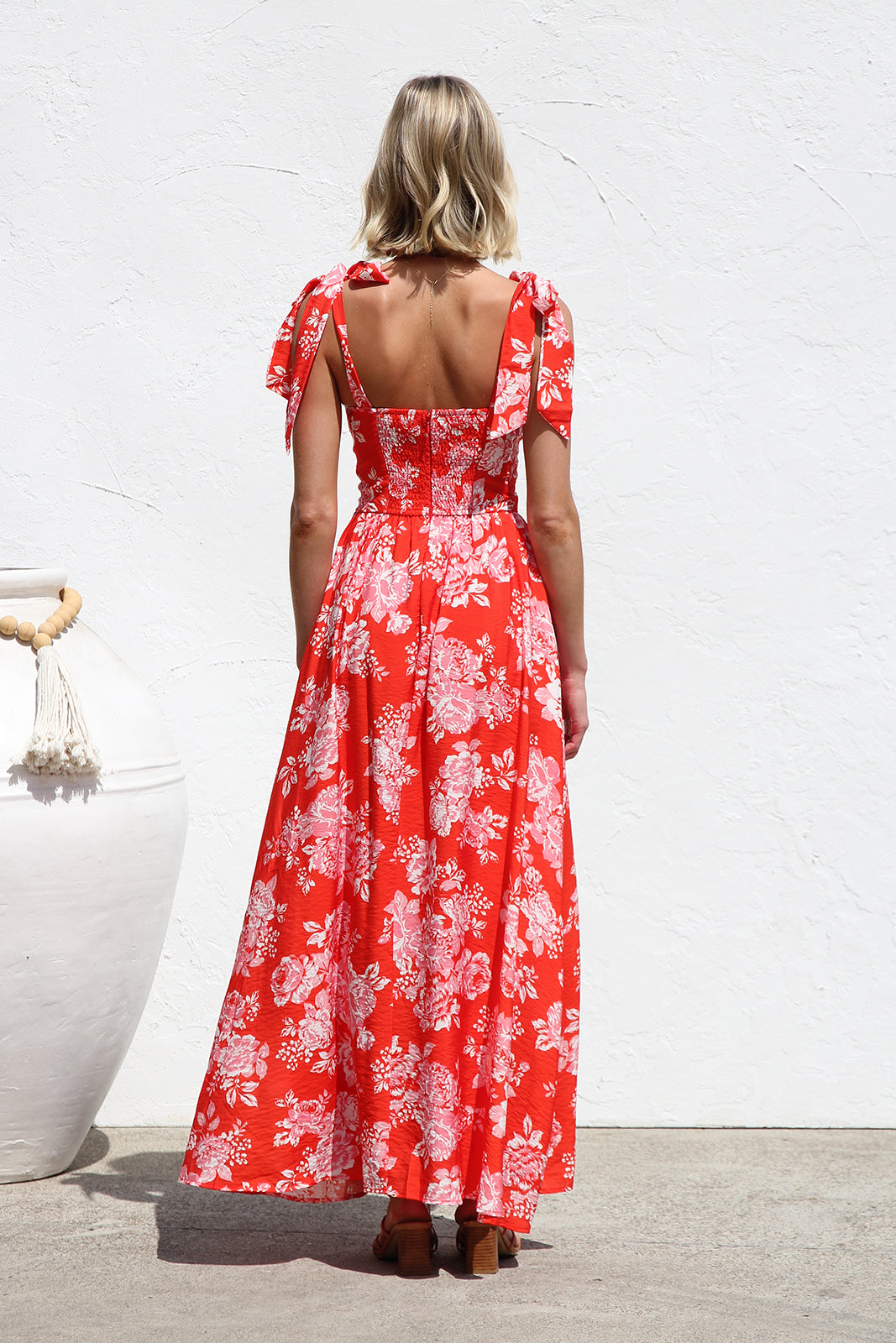 • red/orange base with contrast floral print maxi dress