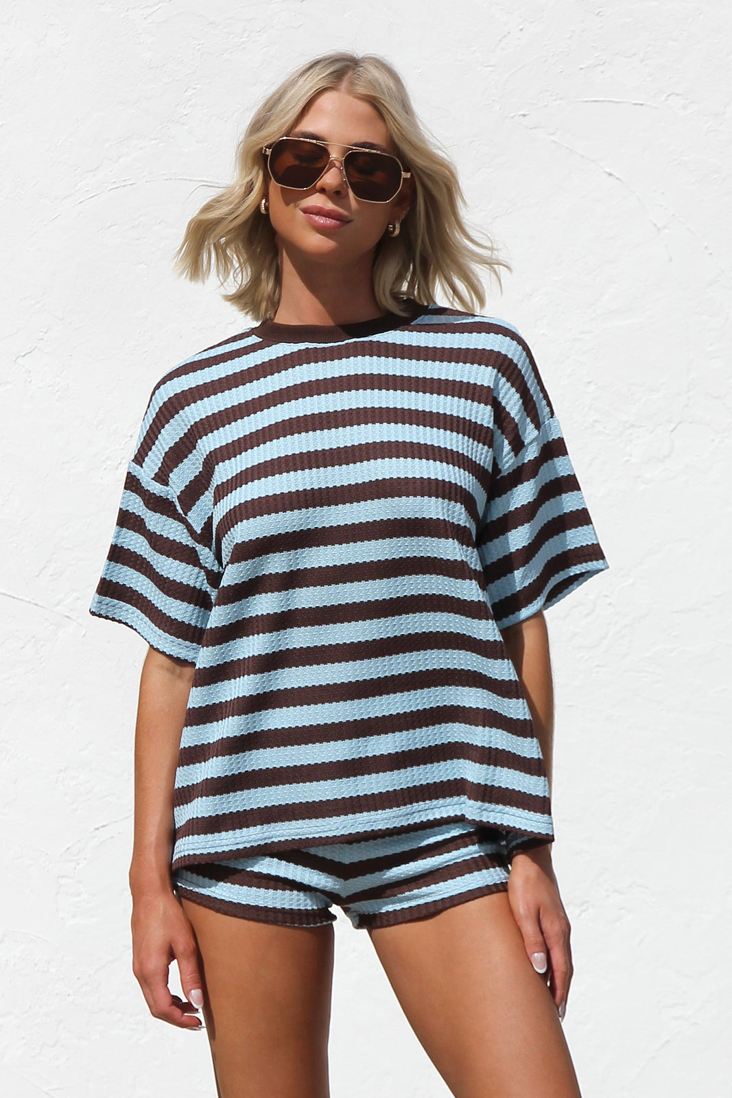 - blue and brown stripe top and short two piece set