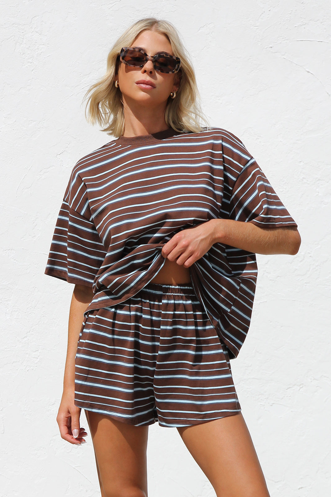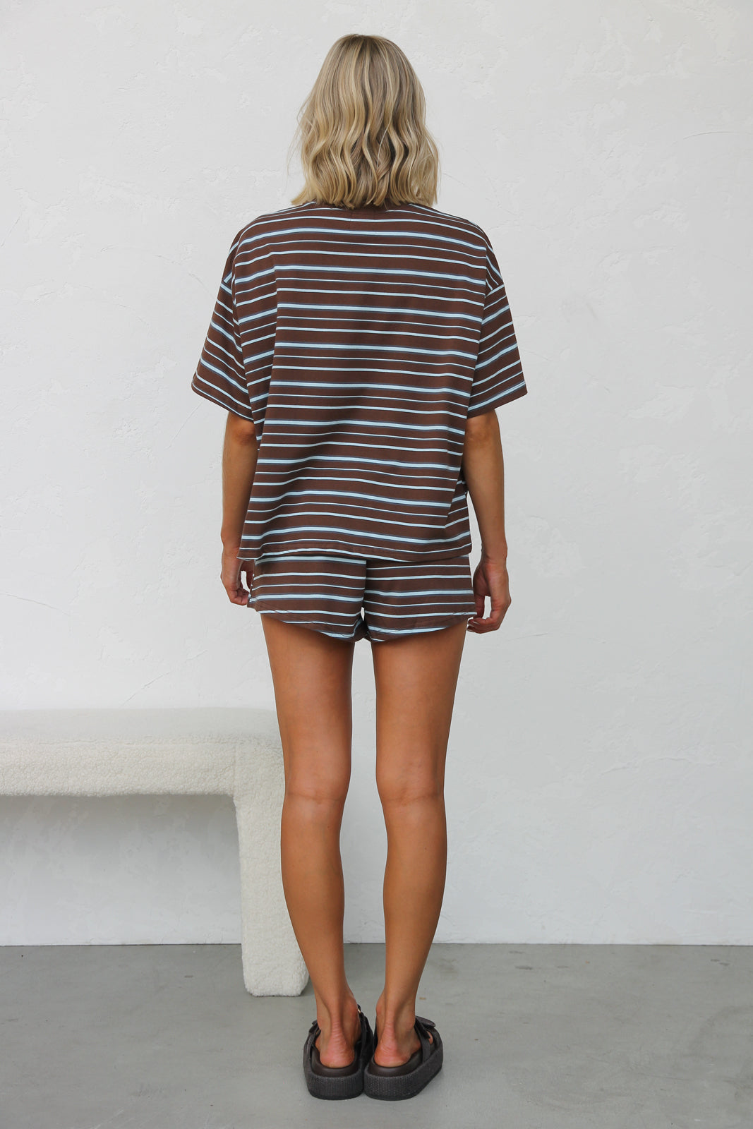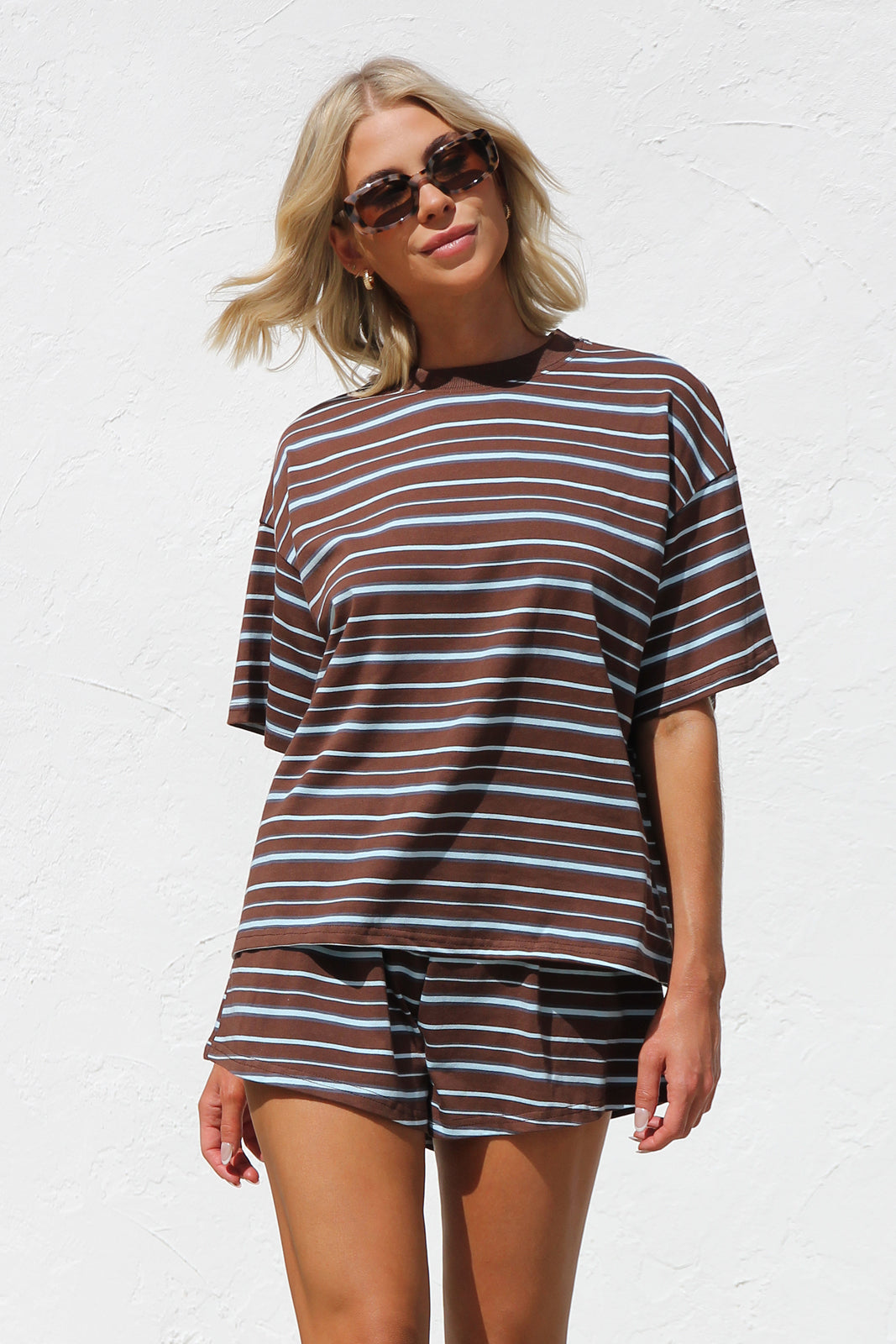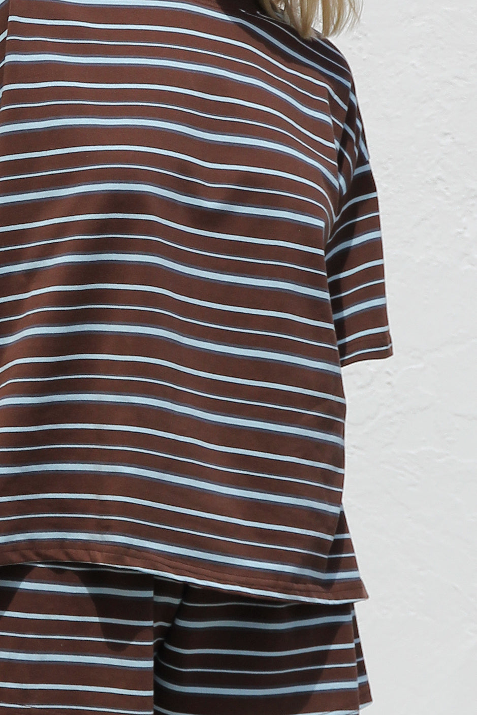 mixed blue stripe on brown base t-shirt and short two piece set