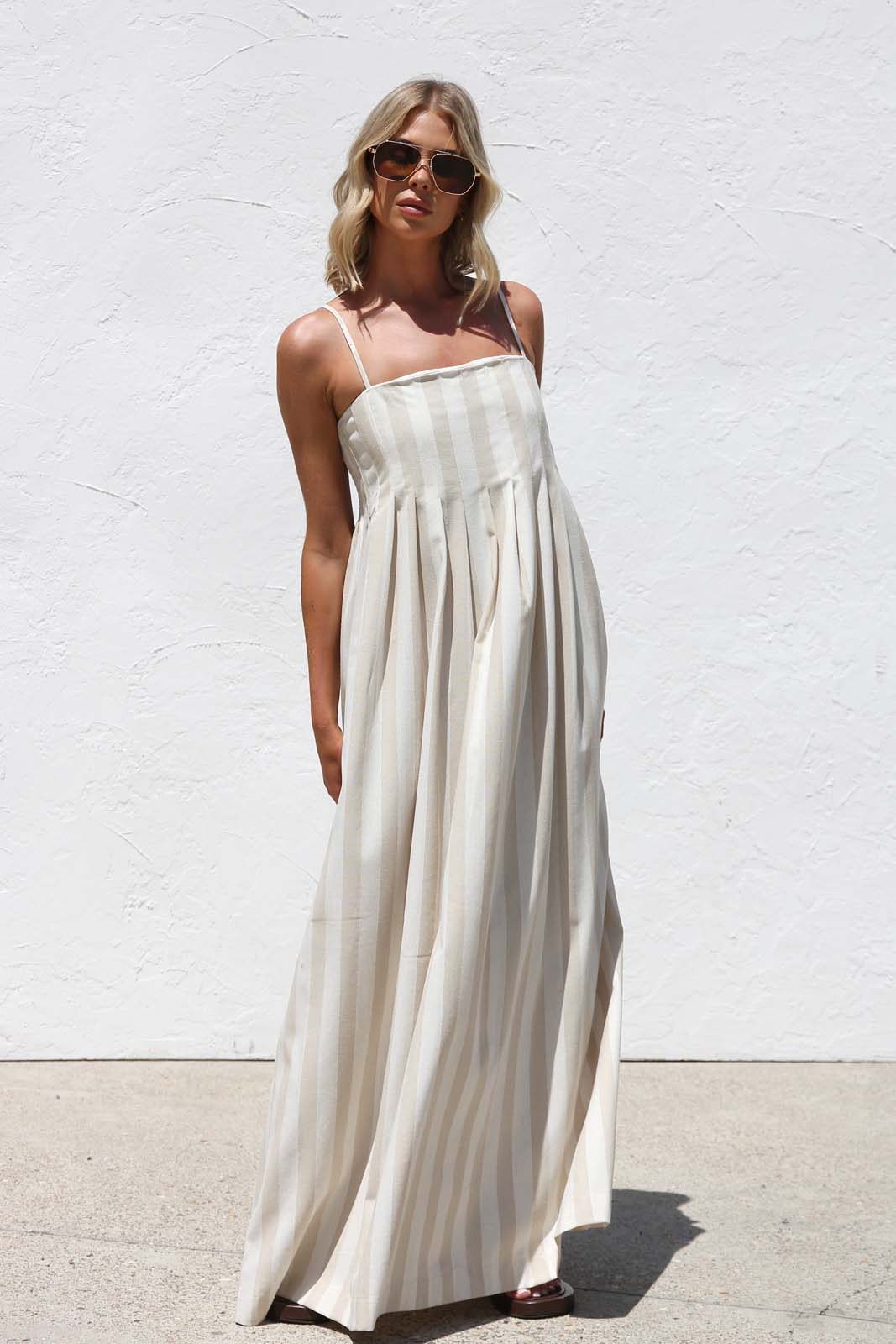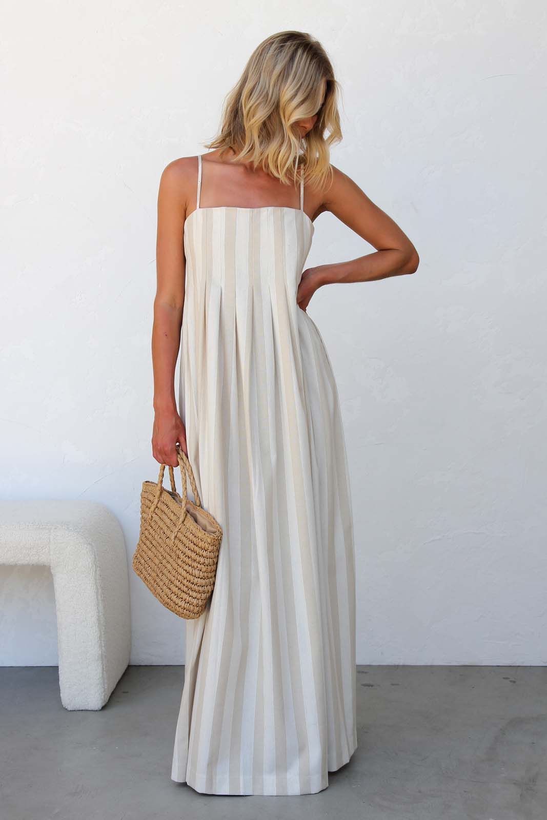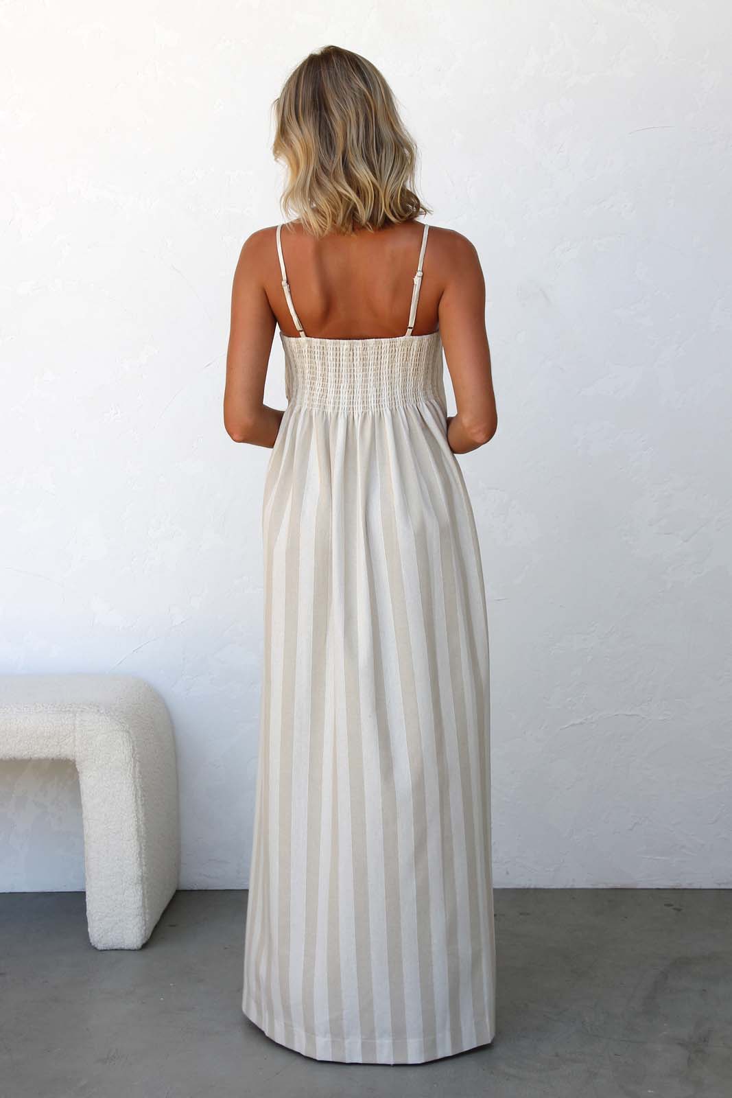 - beige and cream vertical striped maxi dress