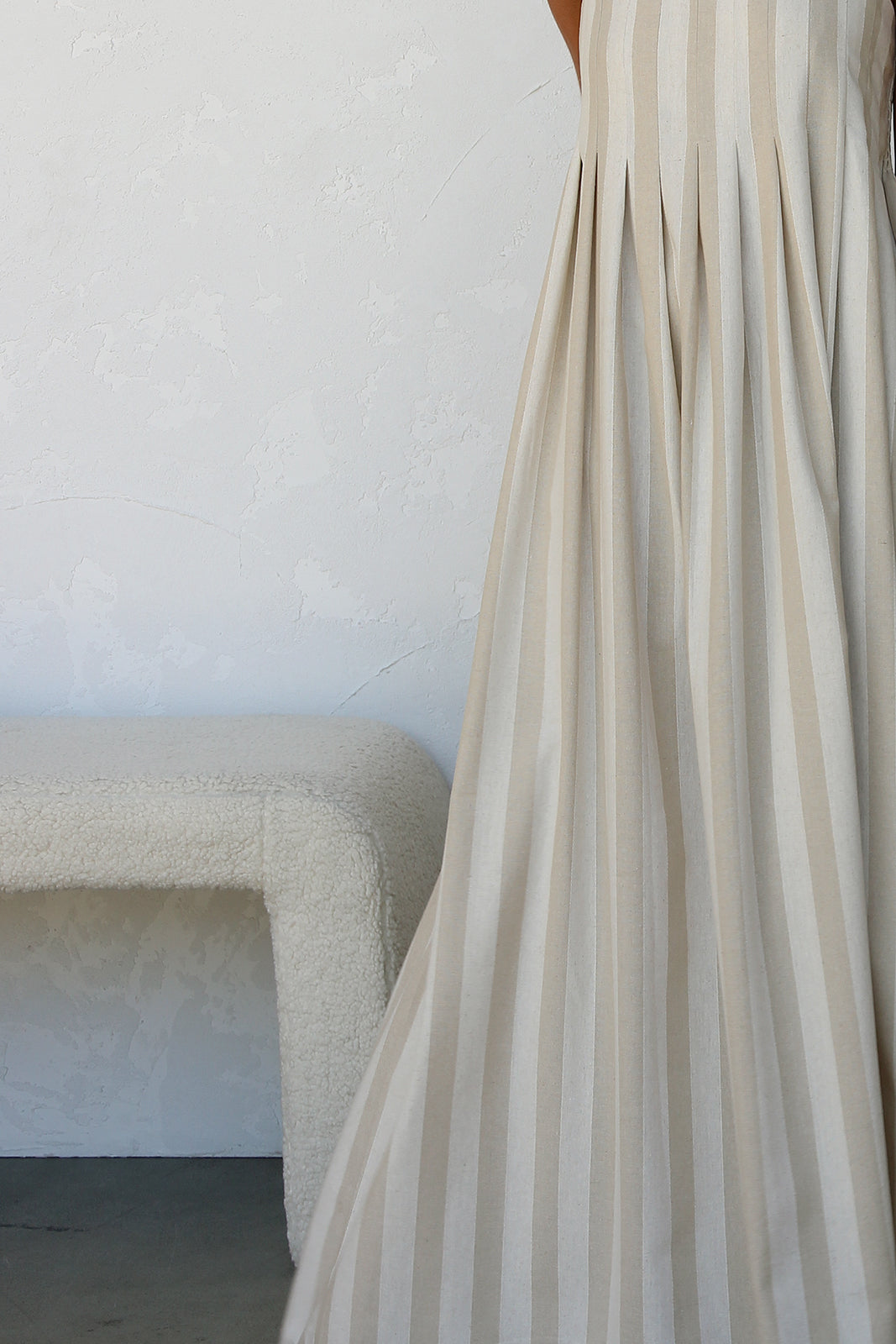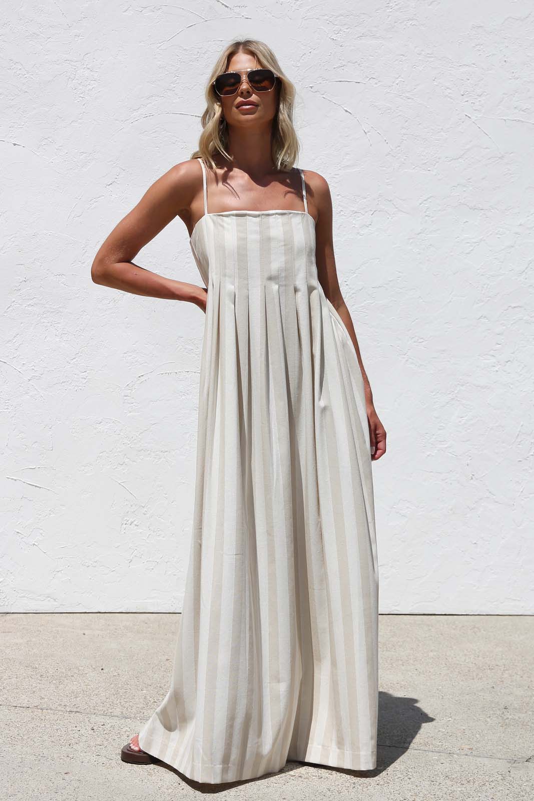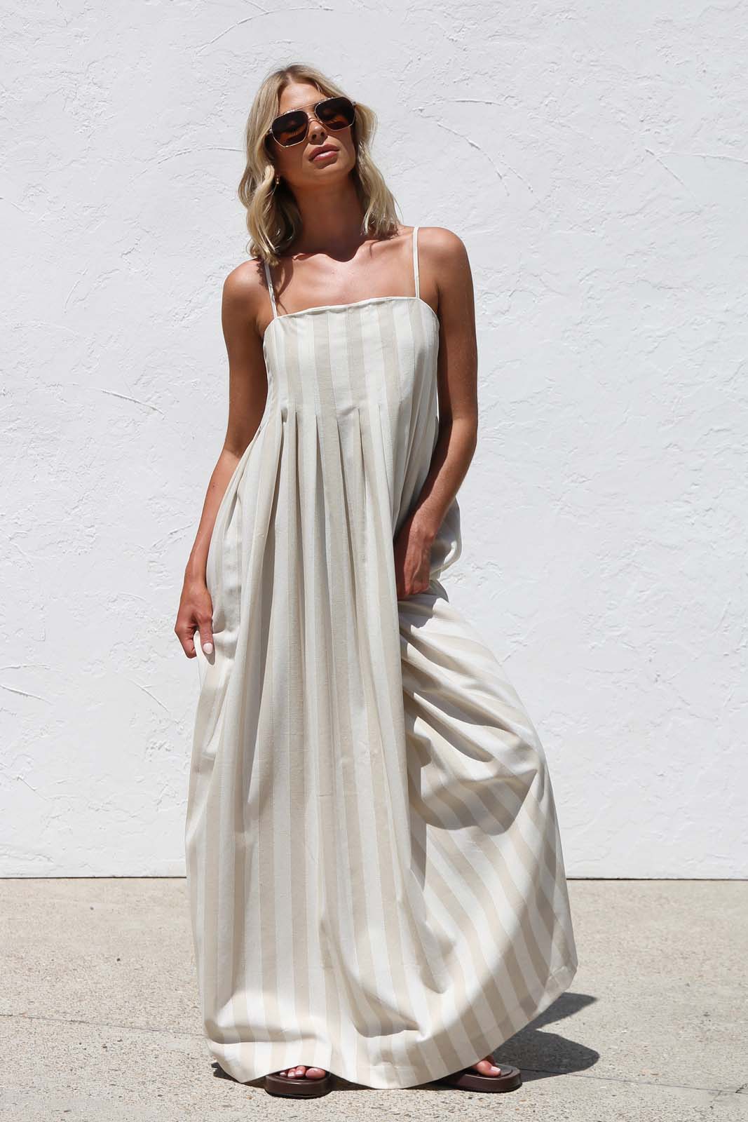 - beige and cream vertical striped maxi dress