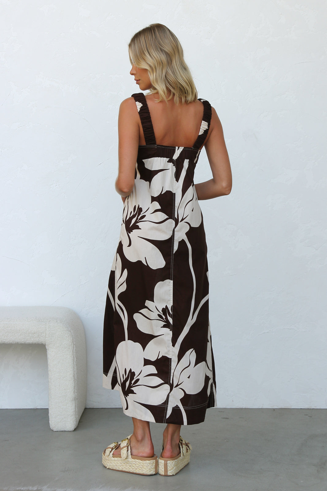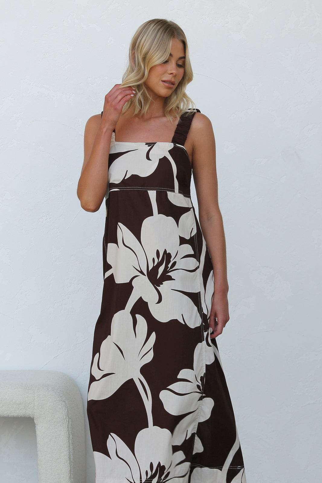 - cream floral print on chocolate base dress