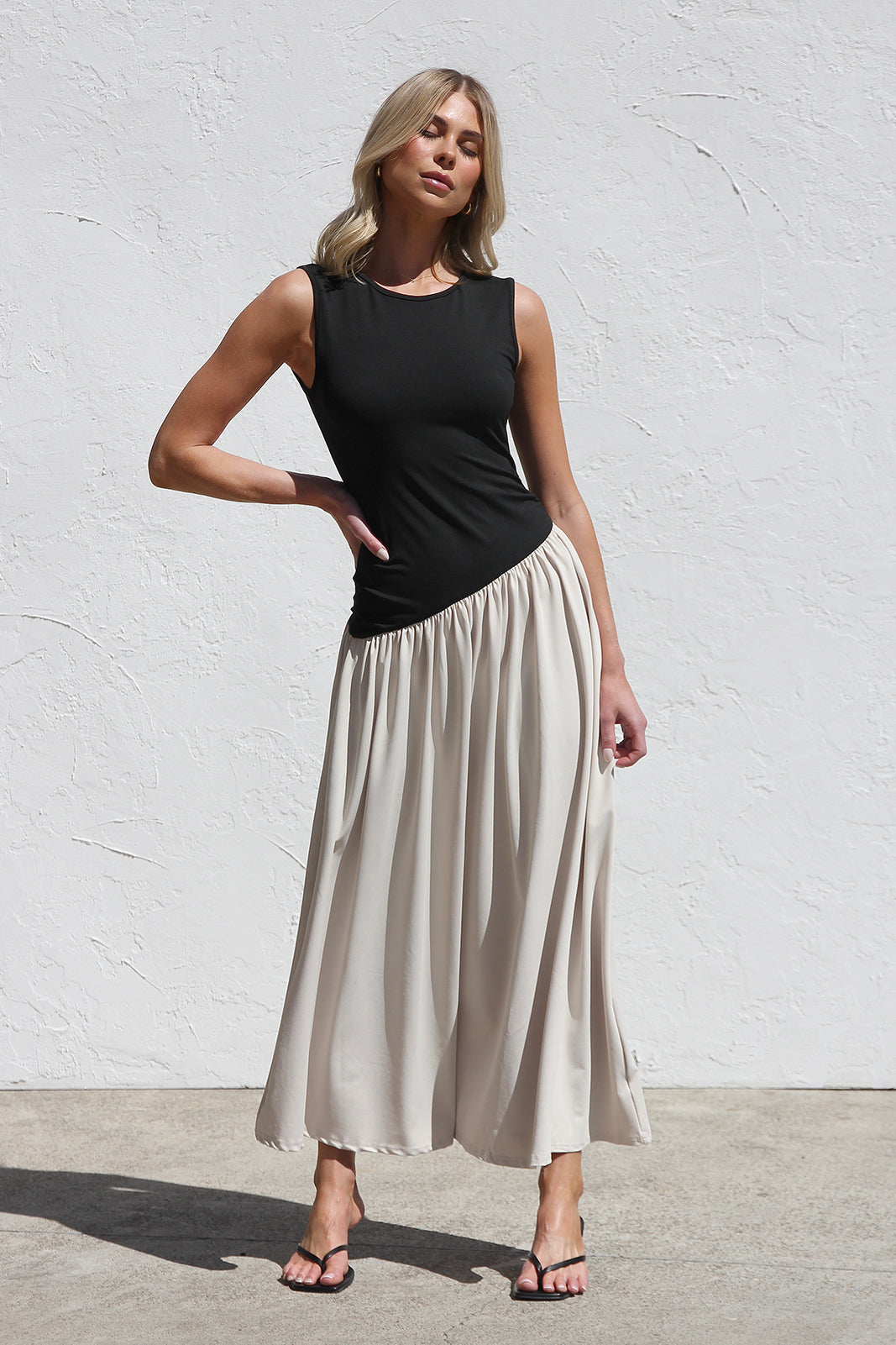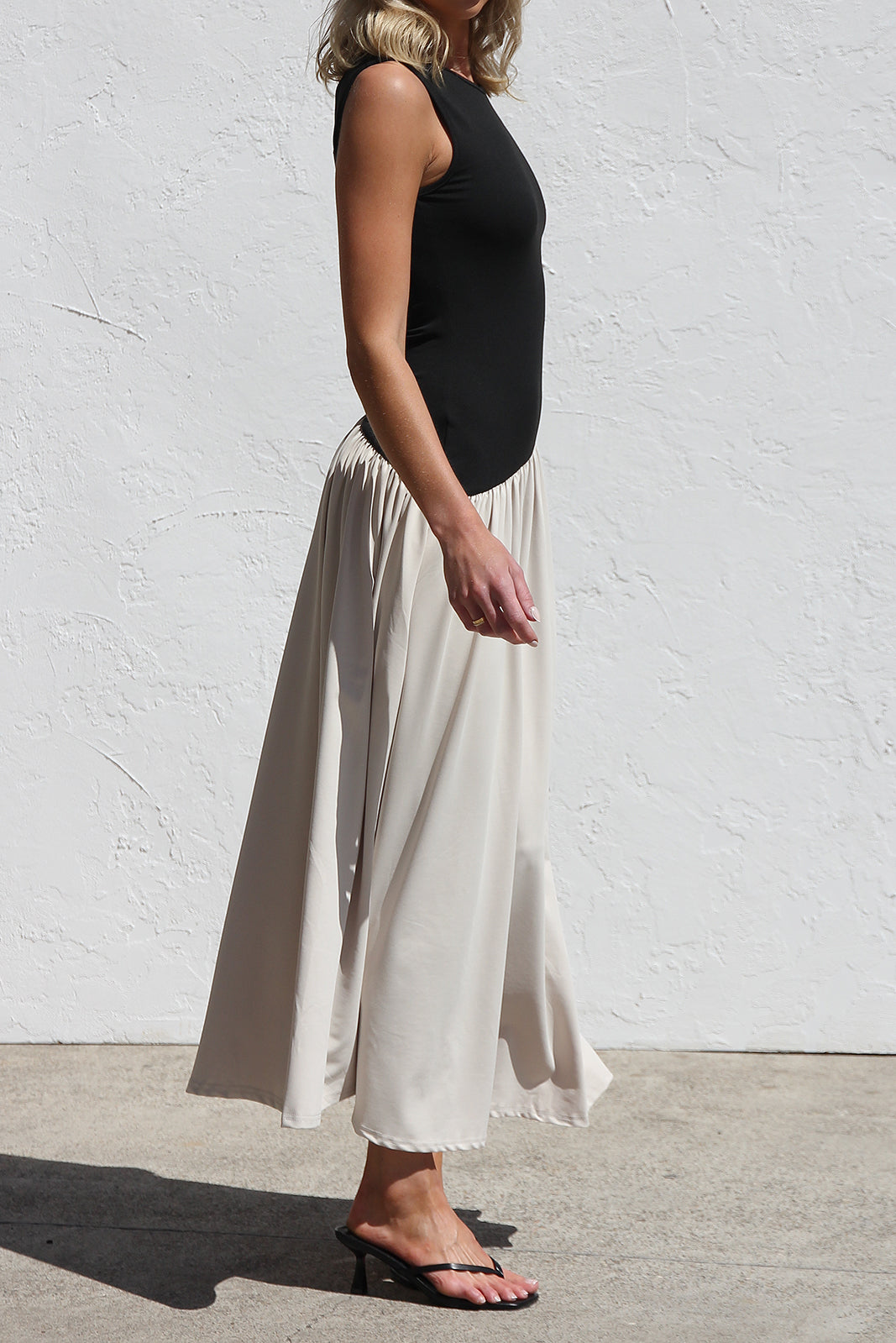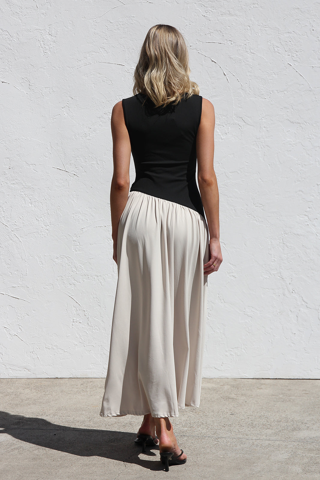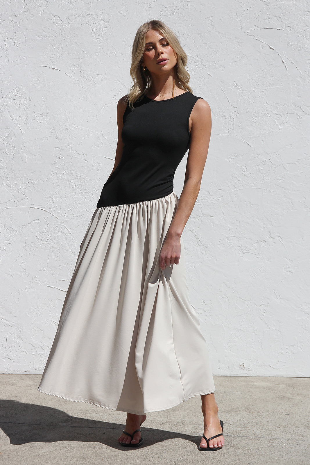 - sleeveless black and nude block maxi dress