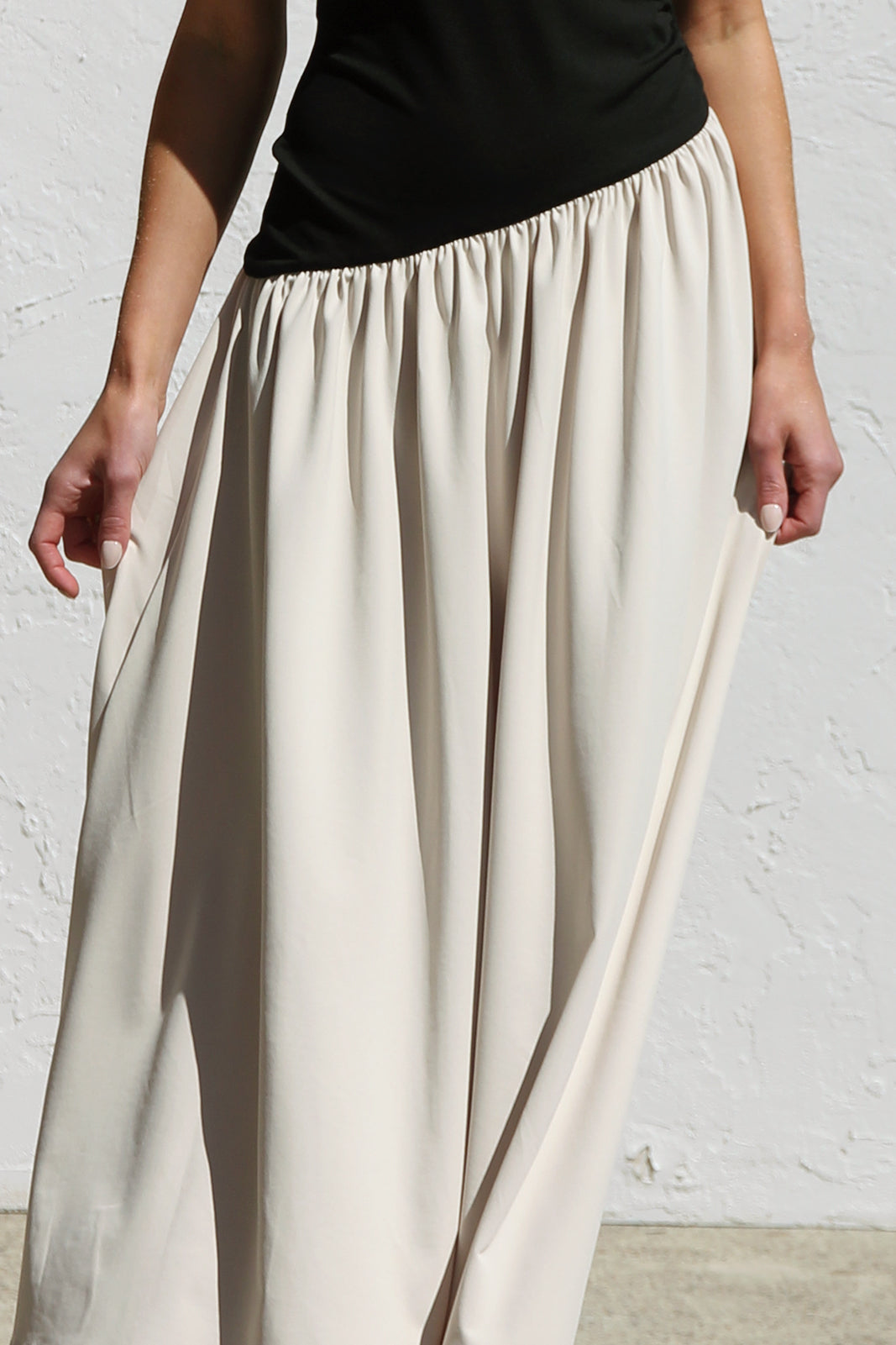 - asymmetrical seam-line on waist/hip with elastic band